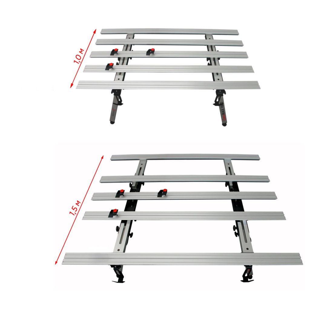 Поперечини слугують як для з’єднання з додатковим столом (для обробки плит довжиною до 3,6 м), так і для зручного транспортування: ламелі можна зібрати та зафіксувати.
